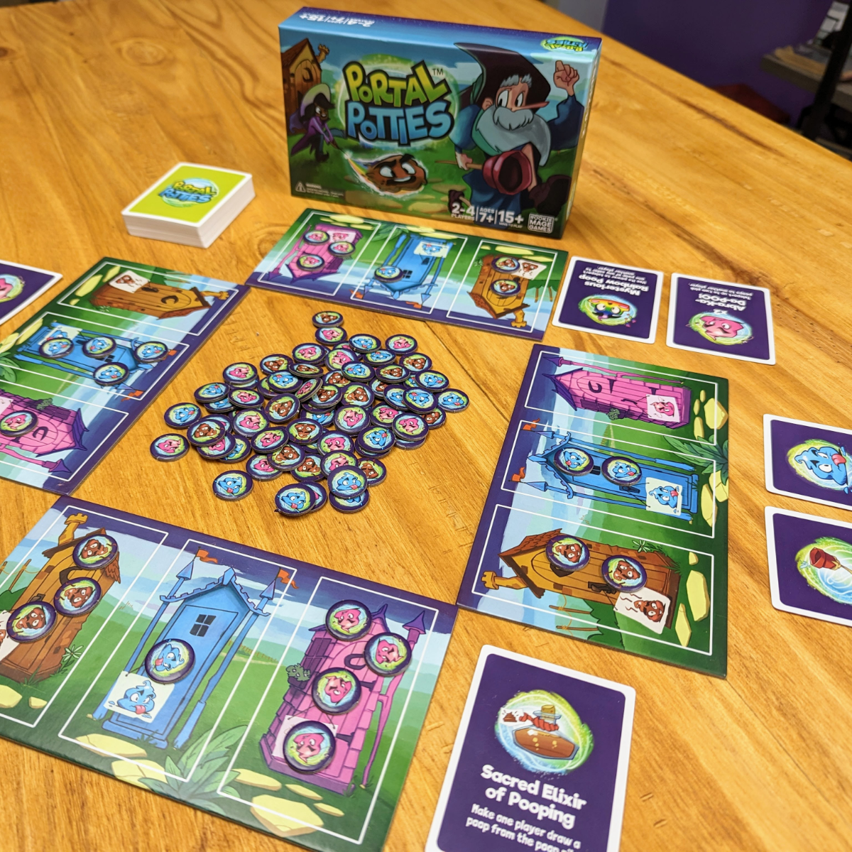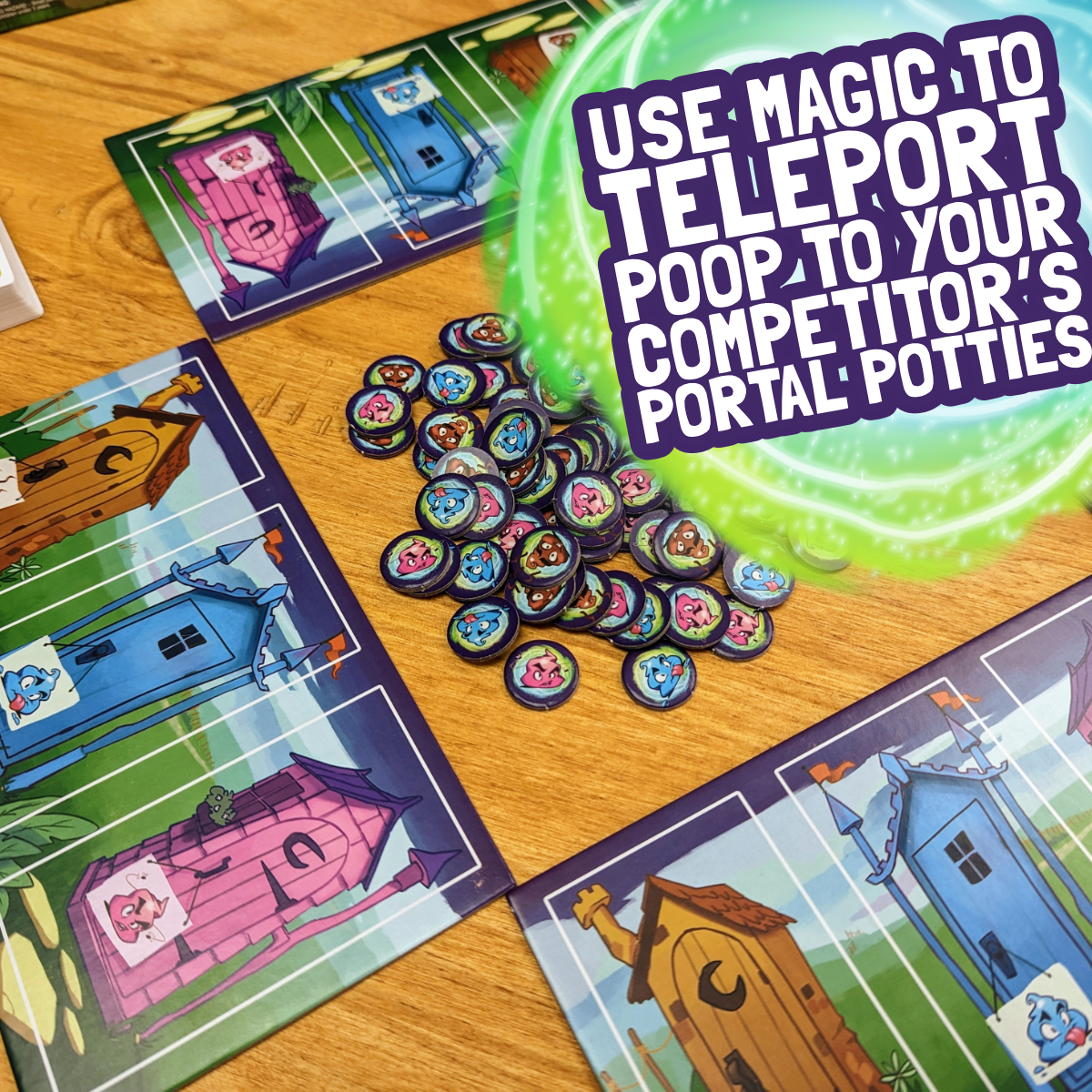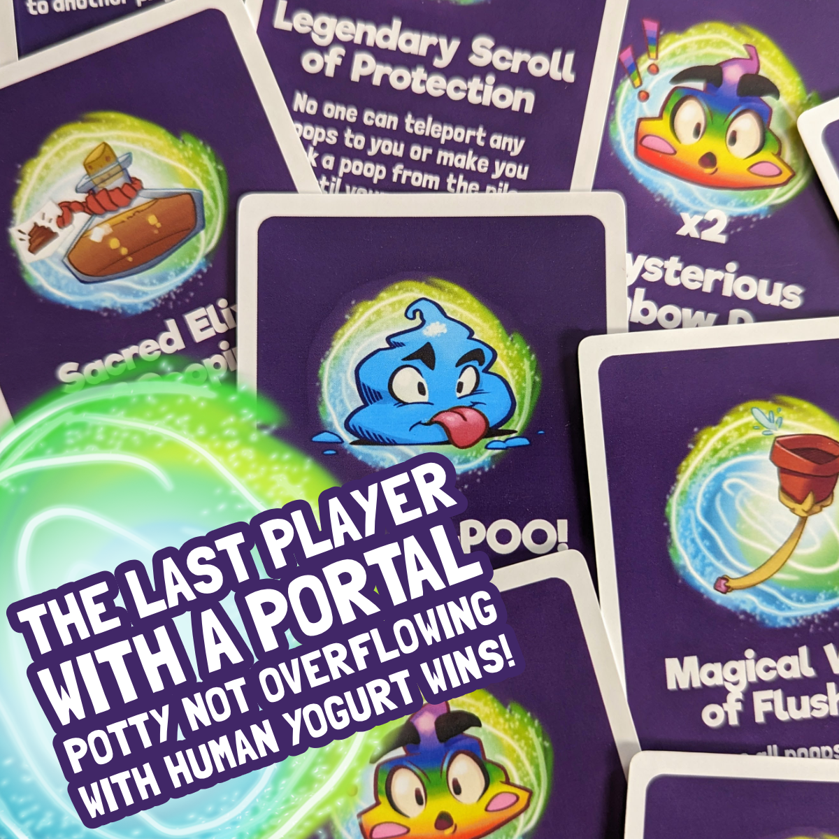 Introducing Portal Potties - the game that's perfect for kids and adults alike! In this wizard-themed game, you get to take on the human waste removal business, using teleportation to send poop straight into your opponents' portal potties. With magic booster cards like the Sacred Elixir of Pooping, the Magical Wand of Flushing, and the Legendary Scroll of Protection, you'll have a blast flushing your opponents down the drain!